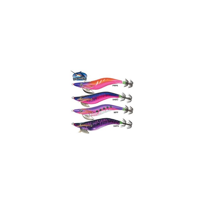 WILLIAMSON KILLER Las poteras o jibioneras Killer o Killex resultan muy atrayentes para los cefalópodos ya sean calamares, chocos, chipirones, sepias, etc. Vienen con dos modelos tipos de tela: Tela Natural que imita a las especies de forma muy realista y Tela en Escamas con mayor porosidad y gran destellos muy atrayentes. Monta dos coronas: Una en acero inoxidable con gran penetración y resistencia a la corrosión y otra corona de Carbono Japan, con mayor poder aun de enganche y evita el desgarre y una gran resistencia a la corrosión. Viene con librea realista, contrapeso equilibrado y ojos brillantes.