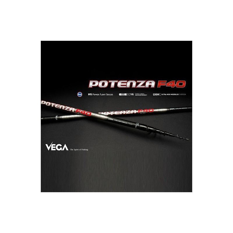VEGA POTENZA F40 La nueva Potenza F40 de la marca Vega es sin duda una caña espectacular, fabricada exclusivamente en carbono UHM ( ultra hihg modulus ) con refuerzo en espiral de CCYR ( cross carbon yarn reinforcement ) y tecnología Nanotech. Su acción es muy equilibrada en la acción de pesca, con un blank fino y de acción rápida. La potenza F40 es una caña pensada para la pesca a boya. Cabe destacar su estética espectacular con acabados exquisitos.